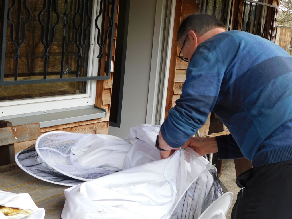 Vorbereitung ist alles, hier wird die Imkerkleidung kontrolliert.